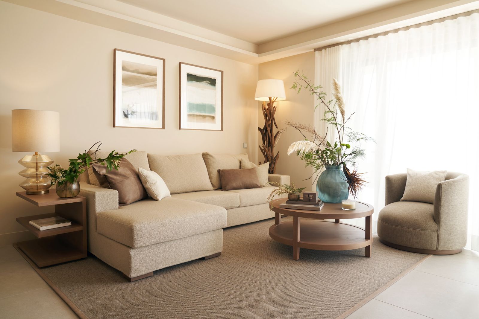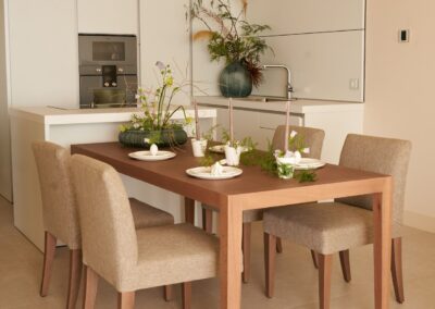 Every piece in this home was custom-made. The sofa, armchairs, and upholstered dining chairs were crafted in soft, textured fabrics that reflect the natural tones of the Costa del Sol. For the solid wood elements — including the coffee table, dining table, sideboards and headboards — we selected premium finishes in warm matte tones to add depth without overwhelming the calm color palette.