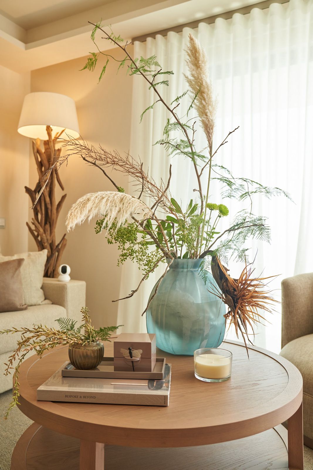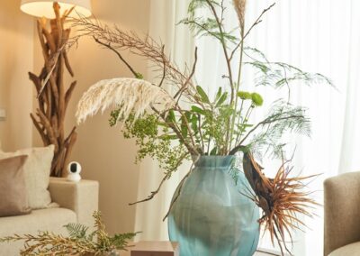 The overall style is understated yet luxurious. From the large round vases filled with wild botanical arrangements to the layered textiles in the bedroom, every detail was carefully considered to bring balance and harmony to the interiors. The result is a space that feels both elevated and effortless — coastal living at its finest.