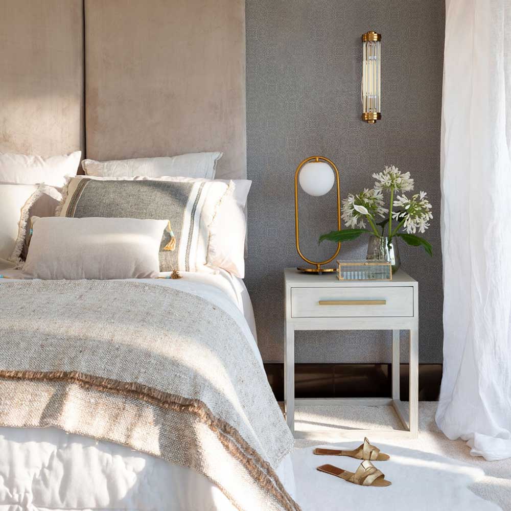 Mesita de noche elegante con acabado de roble en un suave tono blanco grisáceo. Su estructura minimalista con base abierta de madera aporta ligereza visual y un diseño depurado al dormitorio.