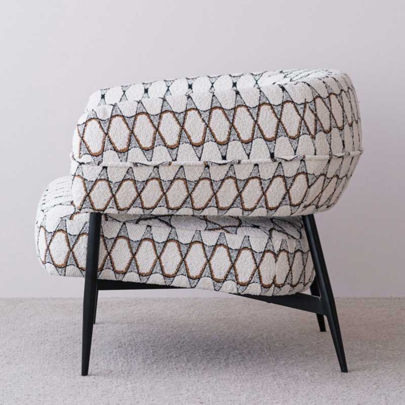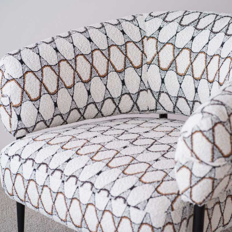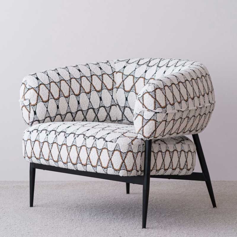 Dale un toque de elegancia contemporánea a tu hogar con este sillón redondo, tapizado en tejido bouclé suave de color blanco roto, con dibujos lineales negros y detalles en ocre. Sus patas metálicas en negro mate sostienen de forma independiente el asiento y el respaldo, creando un diseño ligero y cómodo.