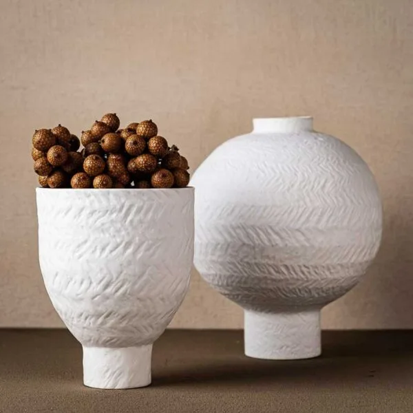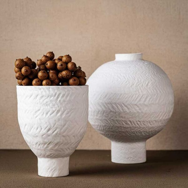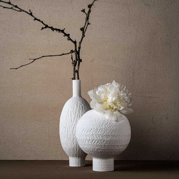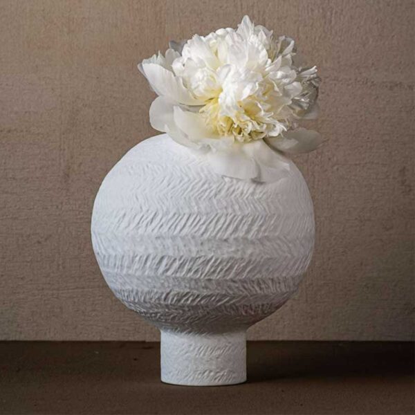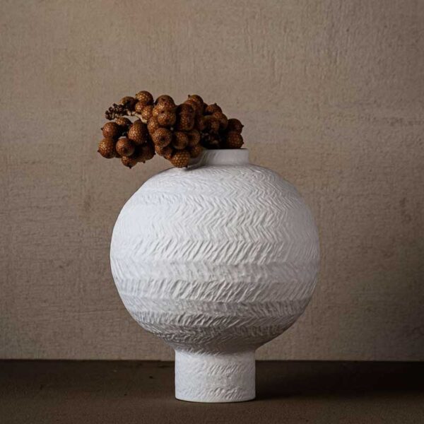 The ARTA Round Vase is a sculptural and refined decorative object made from the finest white Bone China porcelain. With its rounded silhouette and subtly textured surface, this vase becomes a statement piece even without flowers. Its matte finish and intricate pattern highlight artisanal craftsmanship while maintaining a minimalistic elegance.
