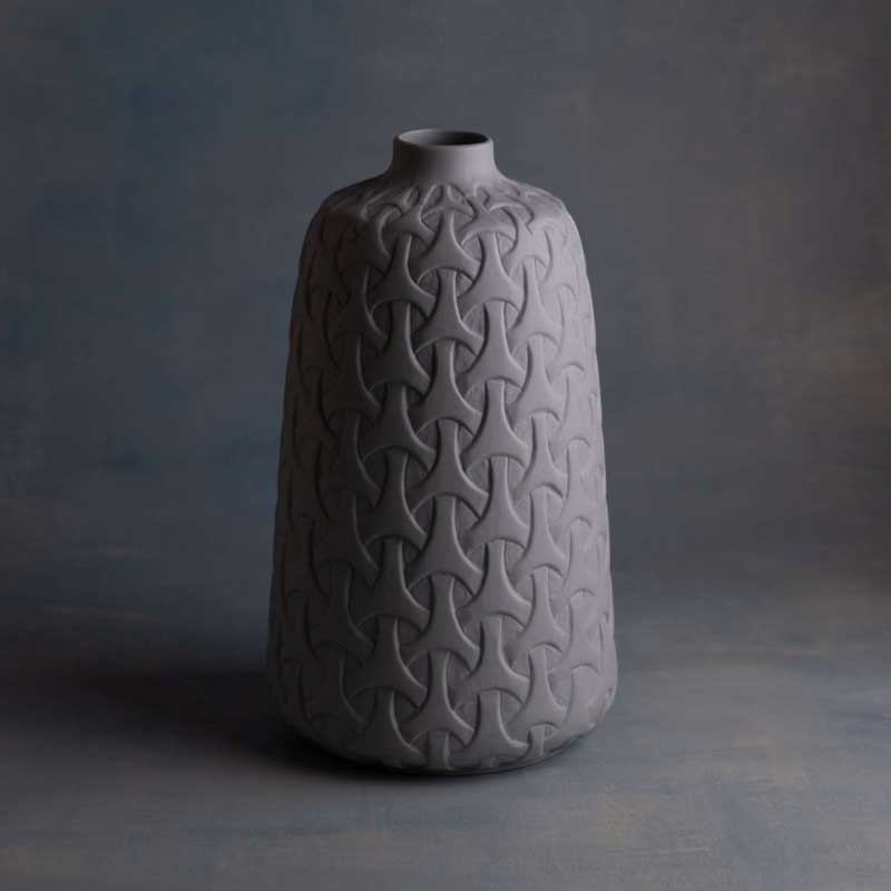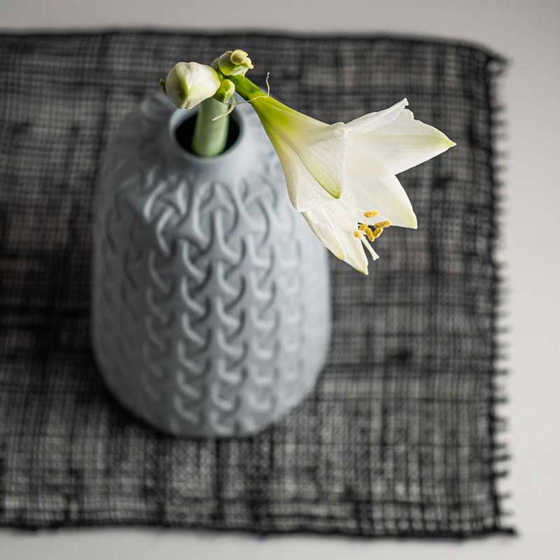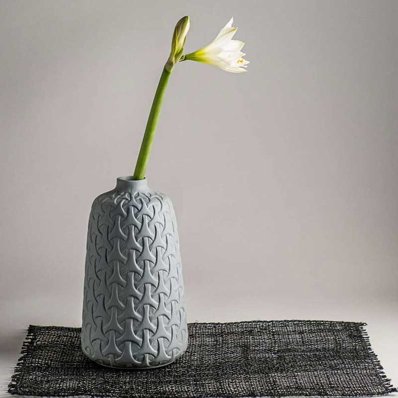The IRMA vase by Klatt Objects impresses with its unique graphic relief and refined craftsmanship. Made from fine porcelain and finished in a serene blue-grey shade, this piece embodies the perfect balance between decorative art and minimalist design.