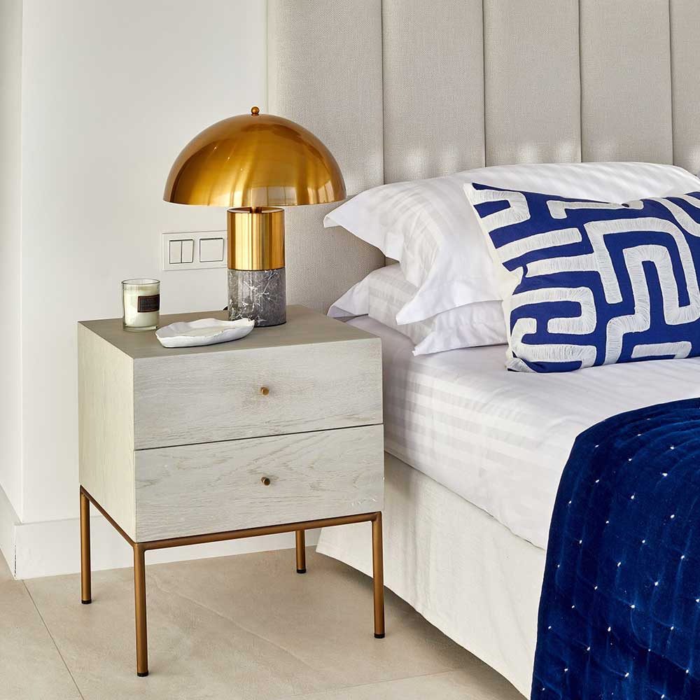 This elegant nightstand features a refined oak finish in a patinated greyish white tone. The linear silhouette is enhanced by minimalist design and a metallic base in aged gold, adding a subtle touch of sophistication.