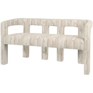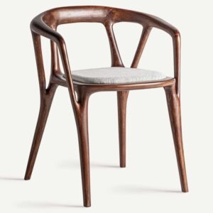 Upholstered dining chairs in beige and black. With rounded shapes, its enveloping design makes it particularly cosy and comfortable. Upholstered in a patterned fabric in black and beige tones for the backrest combined with a textured beige fabric with black velvet piping for the seat. Matte black metal legs.